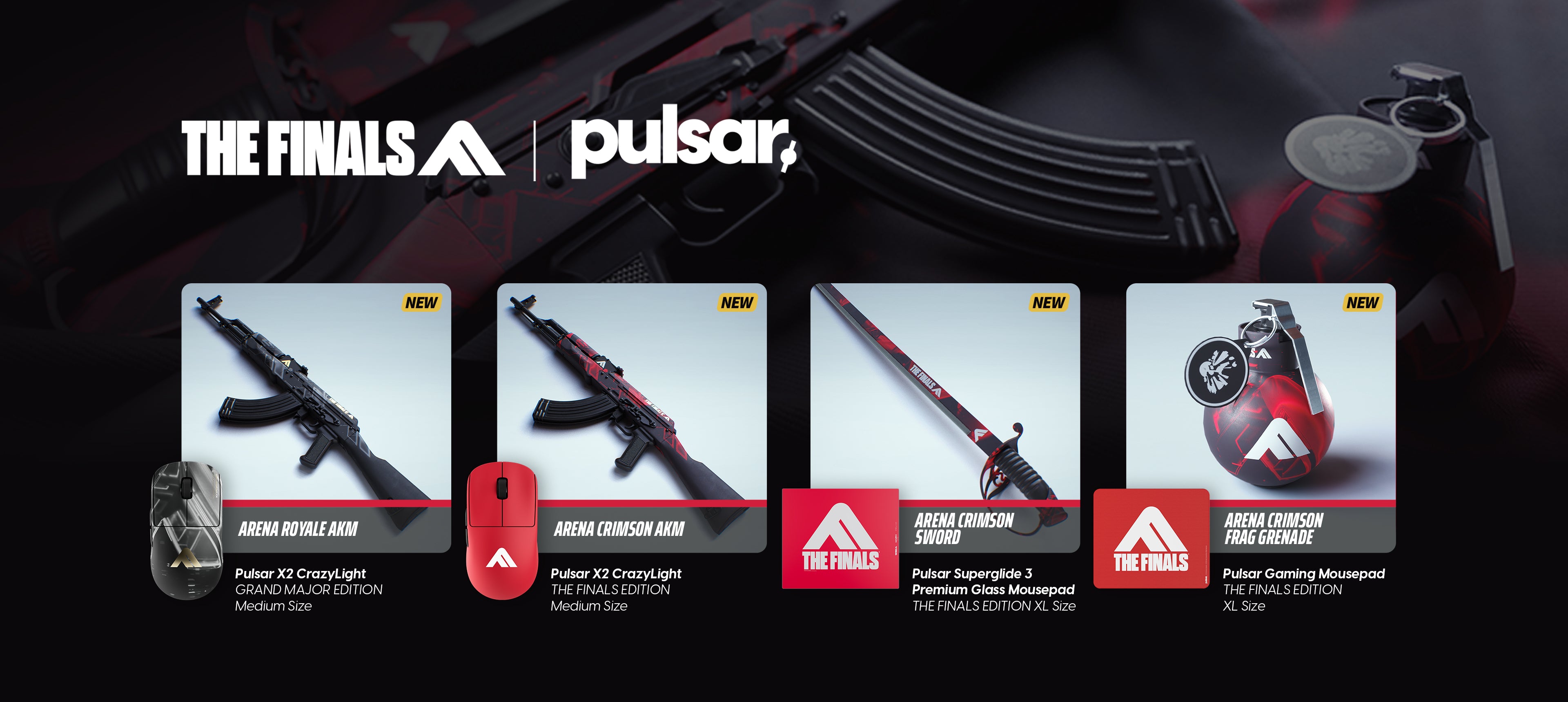 Every purchase of a THE FINALS Edition product will include a unique, in-game skin for THE FINALS. The Pulsar X2 CrazyLight - THE FINALS Edition redeems for the Arena Crimson AKM skin, the Pulsar Superglide Glass Mousepad v3 - THE FINALS Edition comes with the Arena Crimson Sword skin, and the Pulsar Gaming XL Mousepad - THE FINALS Edition grants the Arena Crimson Frag Grenade skin. Additionally, the special Pulsar X2 CrazyLight - Grand Major Edition includes the Arena Royale AKM skin.