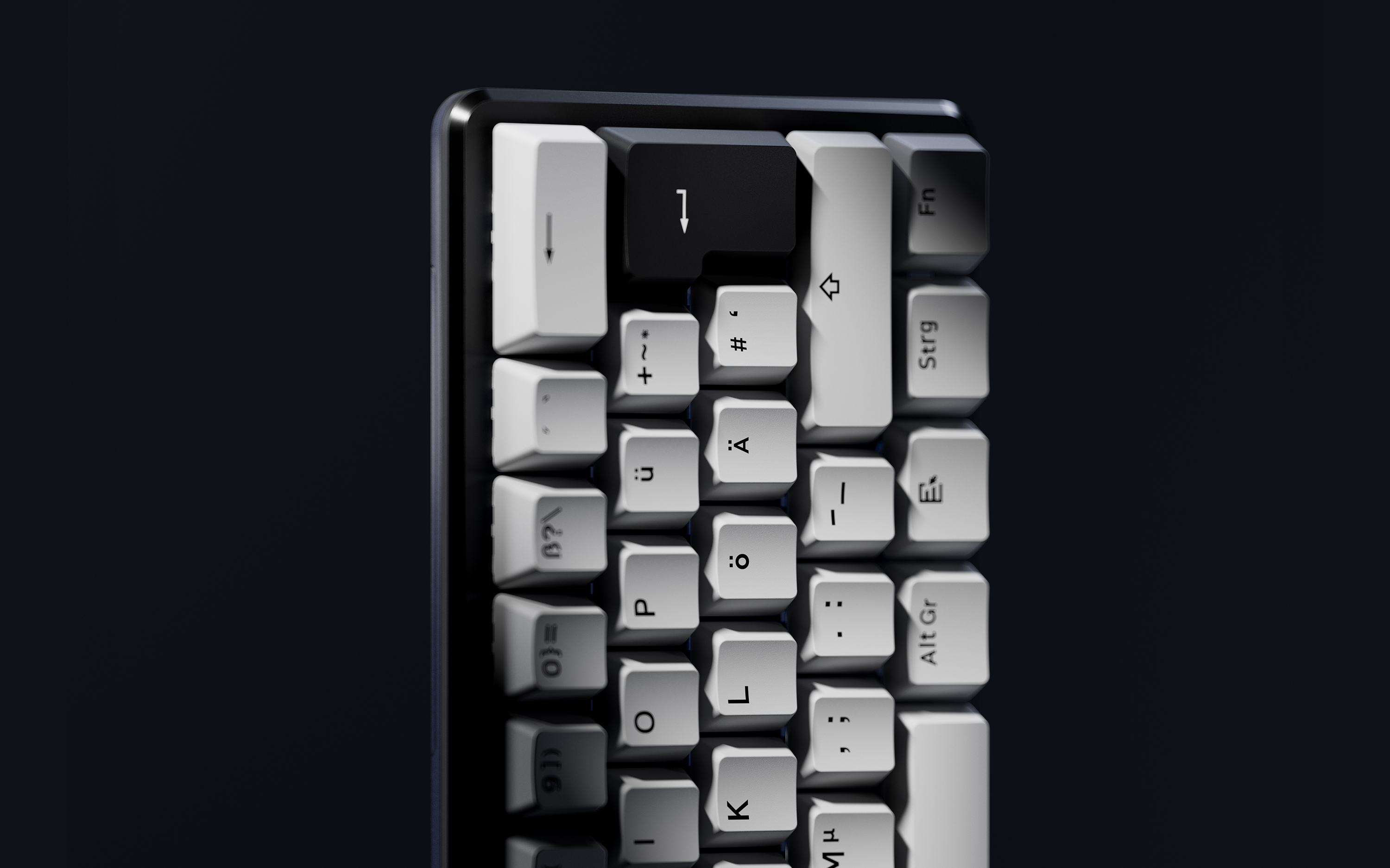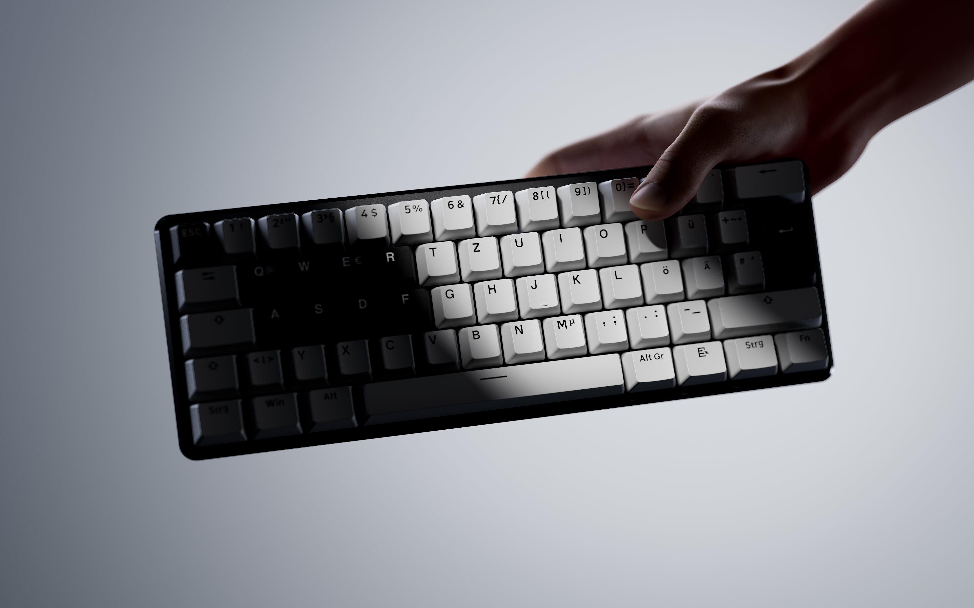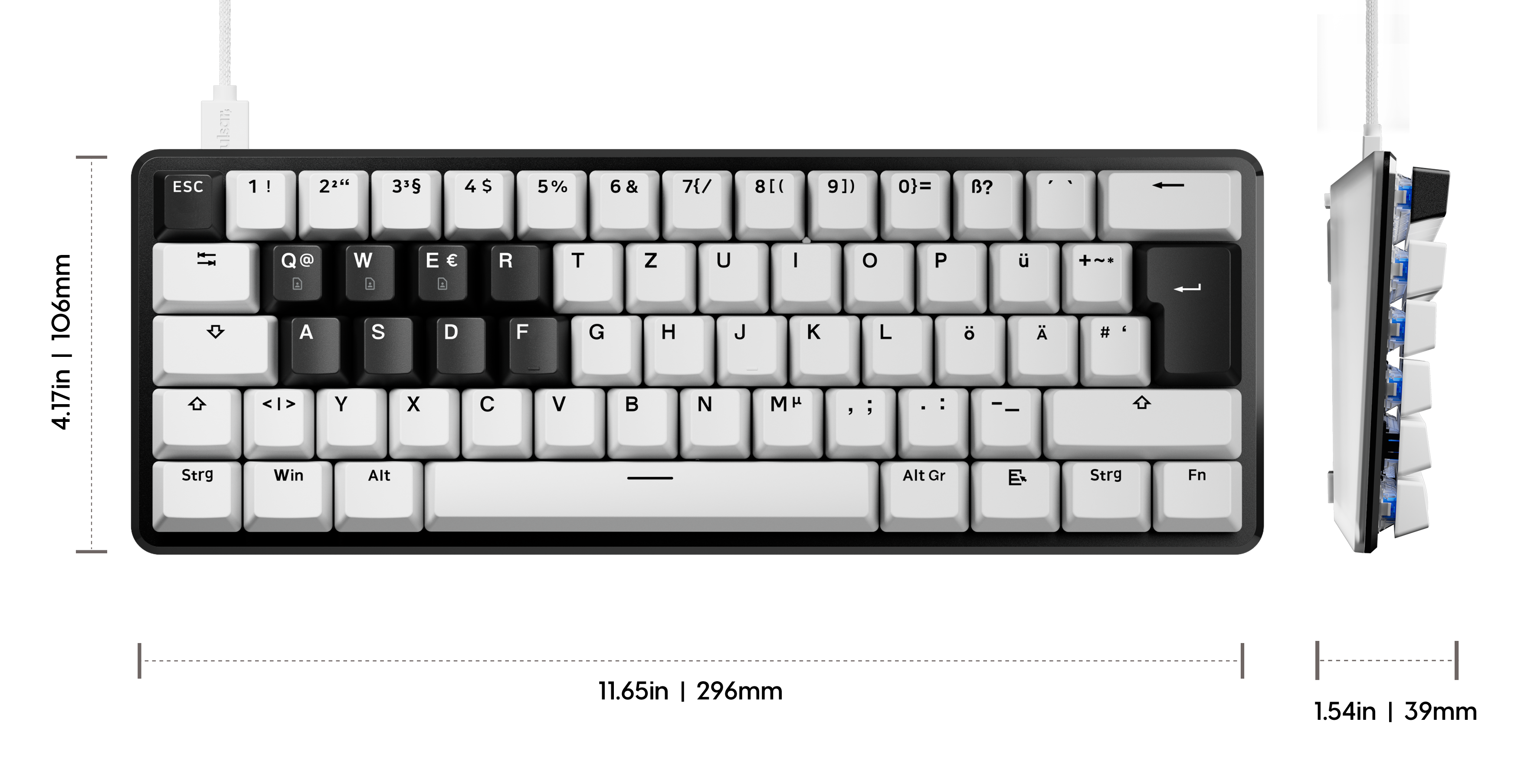 This keyboard is built on the ISO DE layout and comes pre-installed with German keycaps.