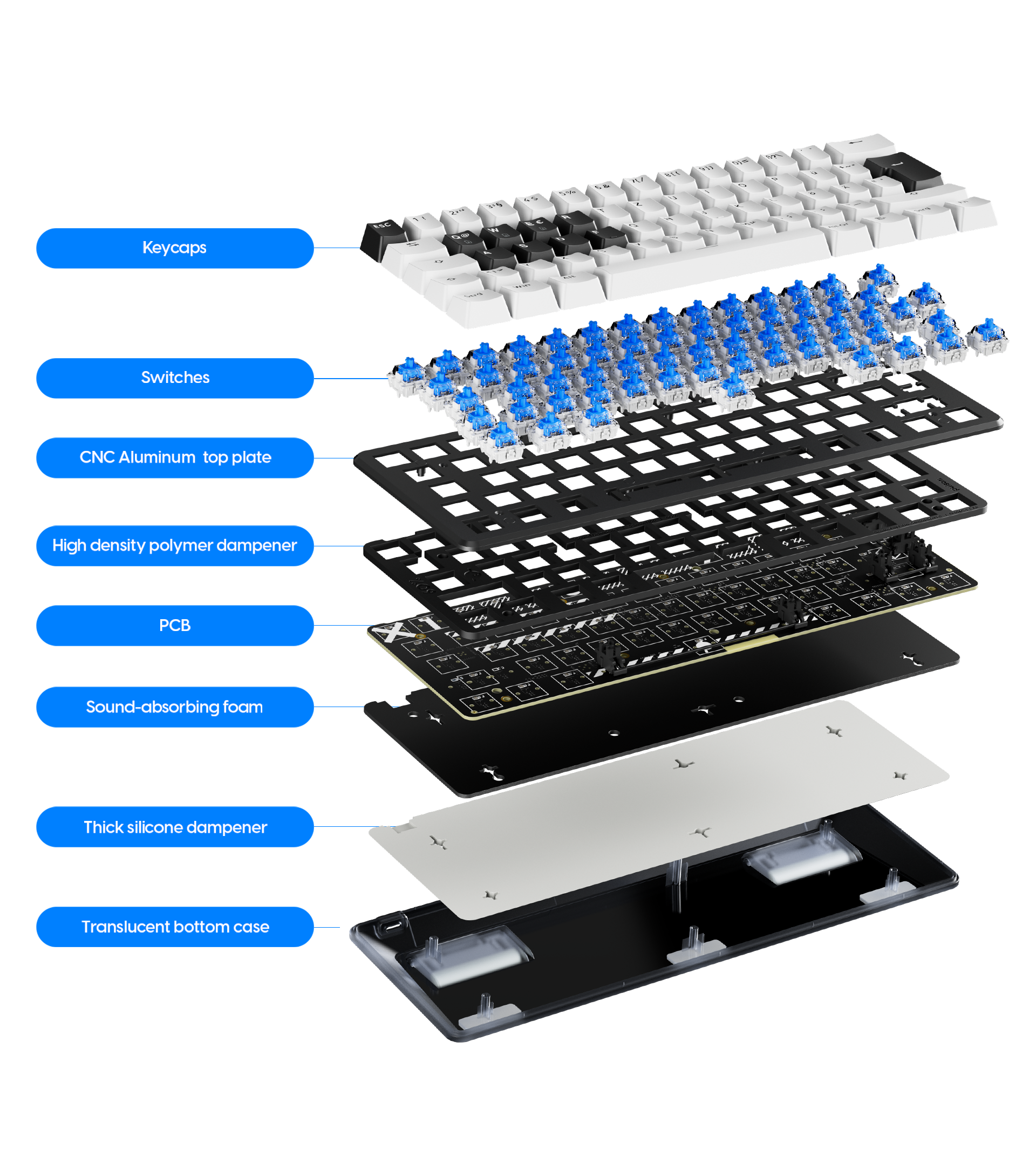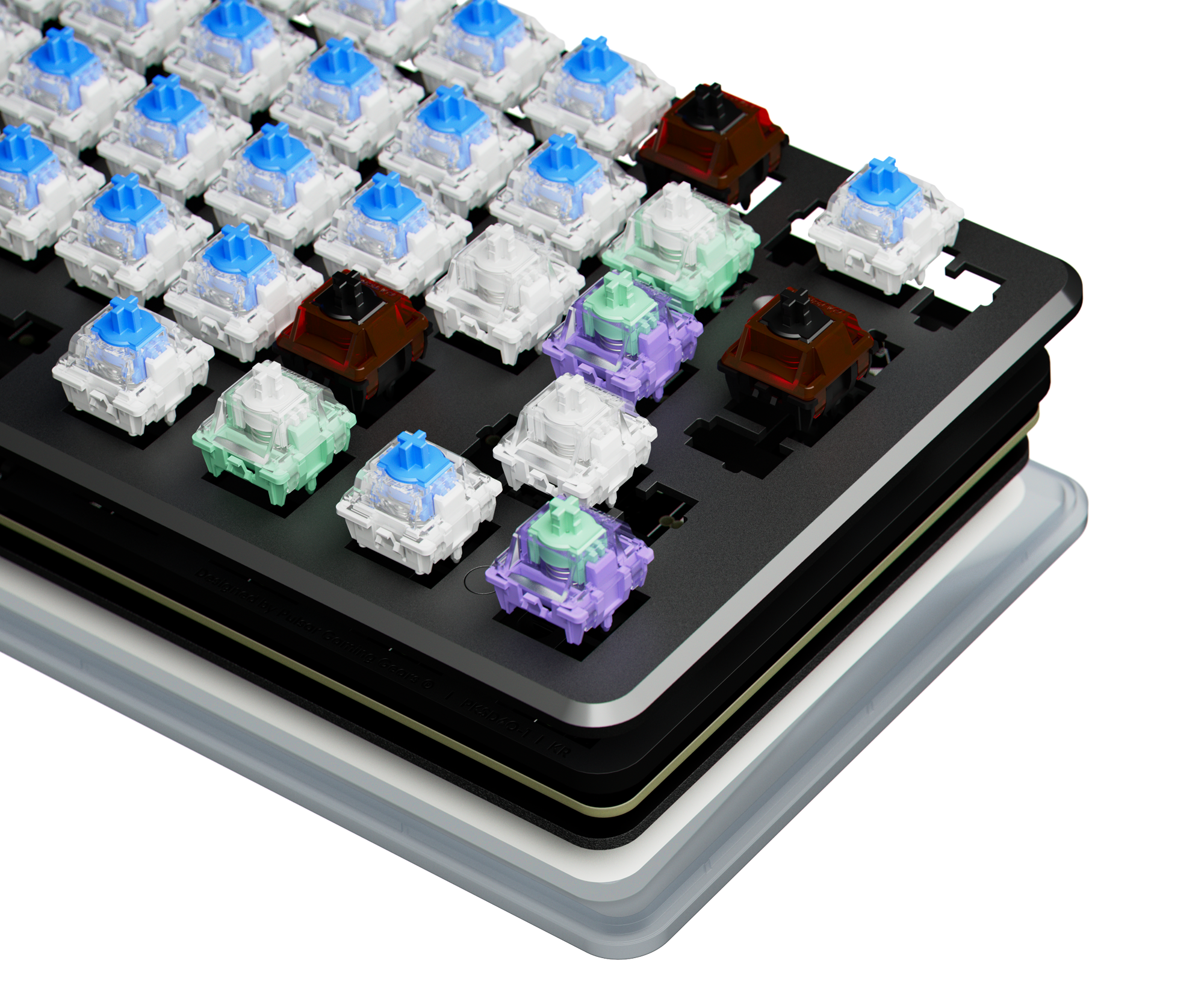 The dual rail system ensures precise alignment of switches without any wobbling, providing a consistent and reliable response. This design minimizes noise and maximizes switch stability, creating a comfortable and pleasant typing environment. Enjoy a seamless typing experience with enhanced accuracy and reduced distractions.