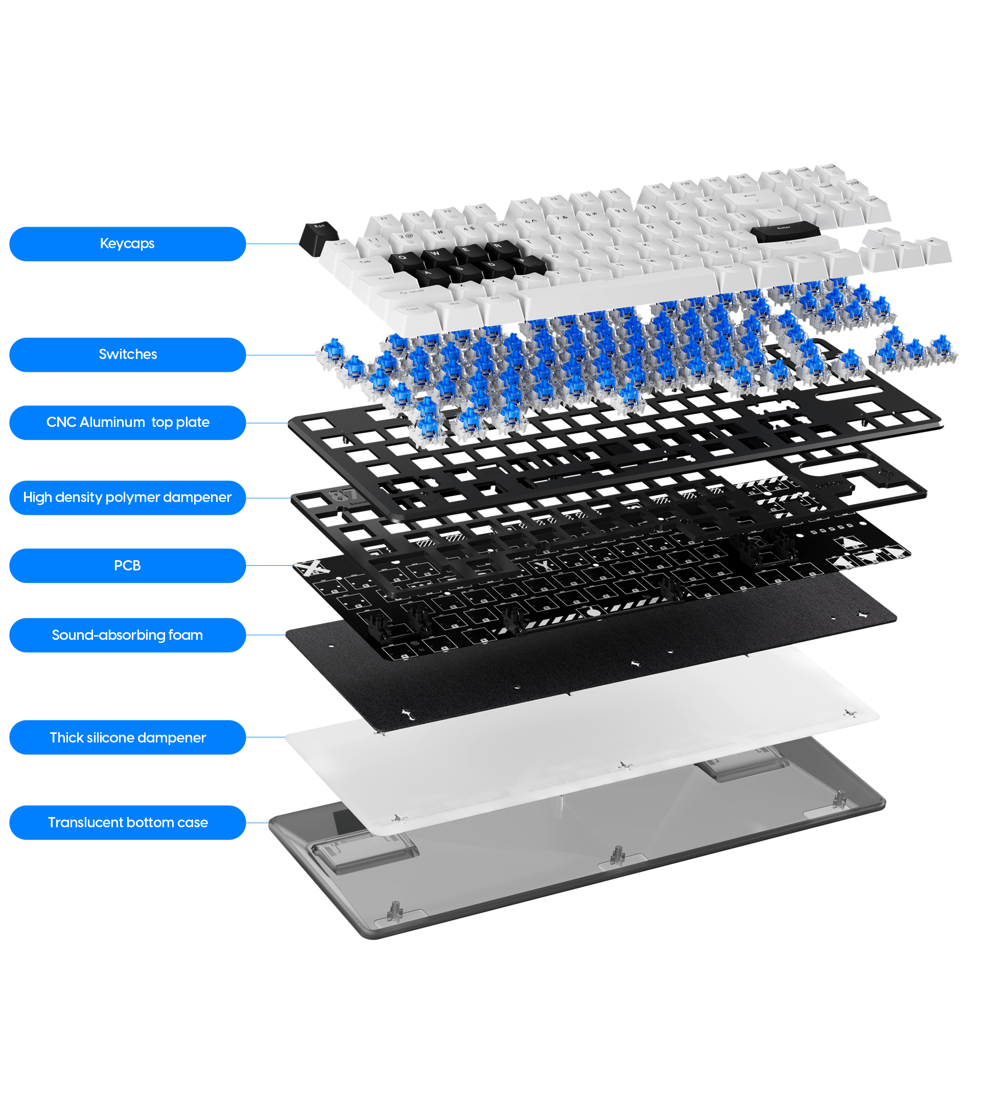 The dual rail system ensures precise alignment of switches without any wobbling, providing a consistent and reliable response. This design minimizes noise and maximizes switch stability, creating a comfortable and pleasant typing environment. Enjoy a seamless typing experience with enhanced accuracy and reduced distractions.